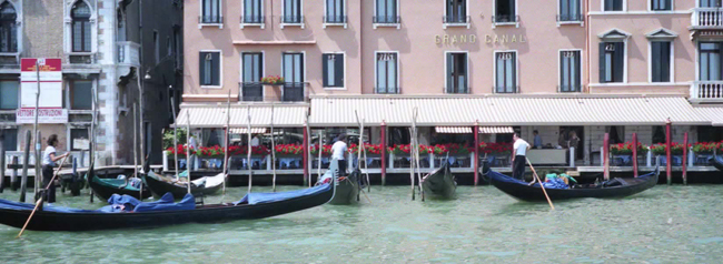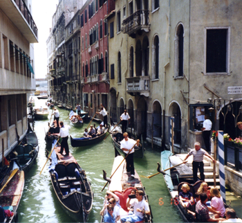 Wenn du hier wärest, könnten wir eine Gondelfahrt unternehmen! Eine Gondel ist ein langes, schmales Boot mit aufwärts geschwungenem Bug und Heck. Der Gondoliere, der Bootsmann, steht im Heck und rudert, manchmal singt er dabei auch italienische Lieder für seine Passagiere, und das kann sehr romantisch sein, aber du bist wenig an Romanzen interessiert, oder?