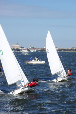 Kinder verschiedener High Schools (bei uns etwa 8. - 12. Schulklasse) der Region um Charleston messen sich auf 420er Booten bei der Leukämie Pokal-Regatta. Die gleiche Segelbootsklasse wird auch an den Universitäten gesegelt. Wenn du die Augen zusammenkneifst, kannst du die Battery im Hintergrund erkennen?
